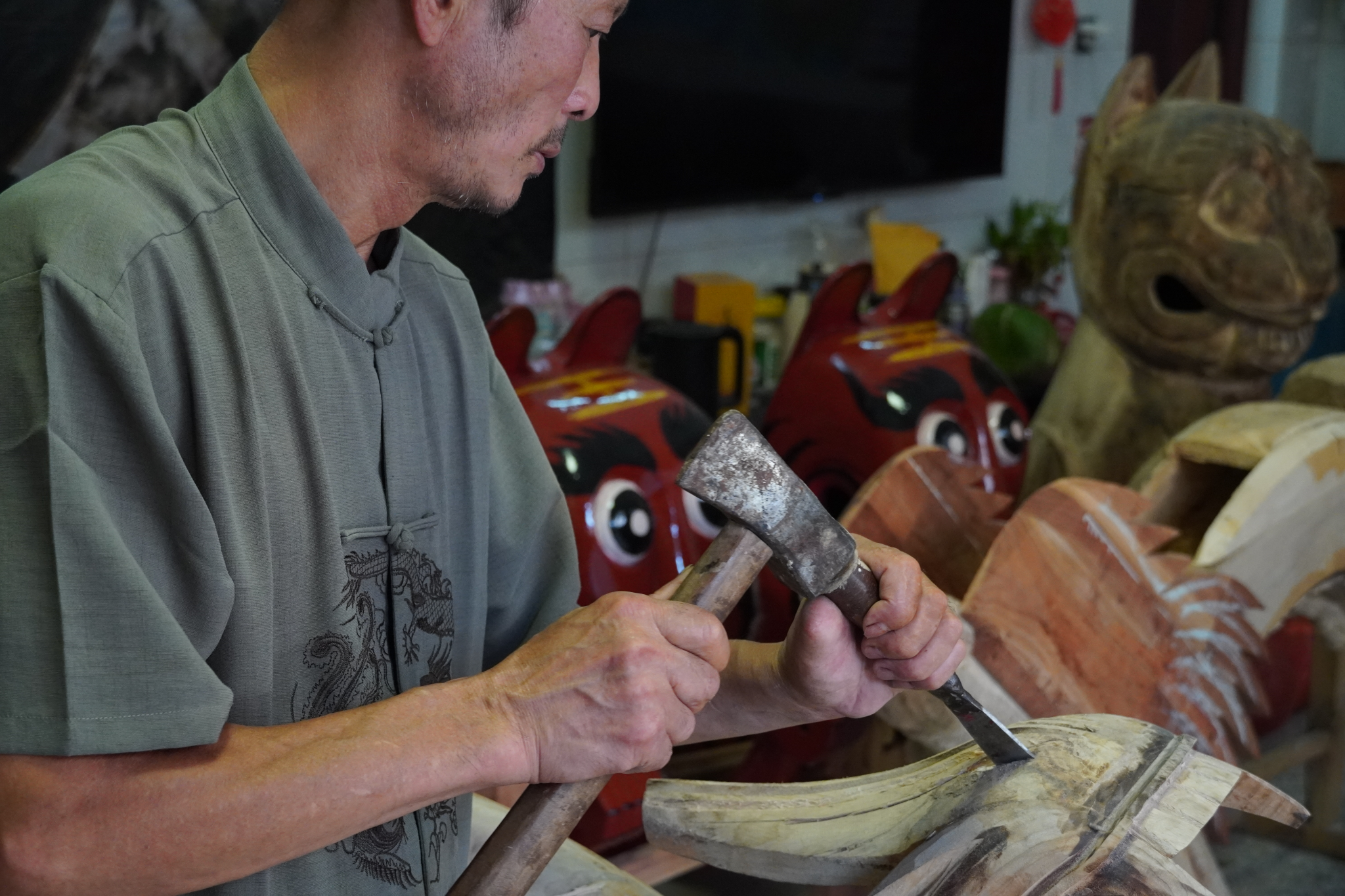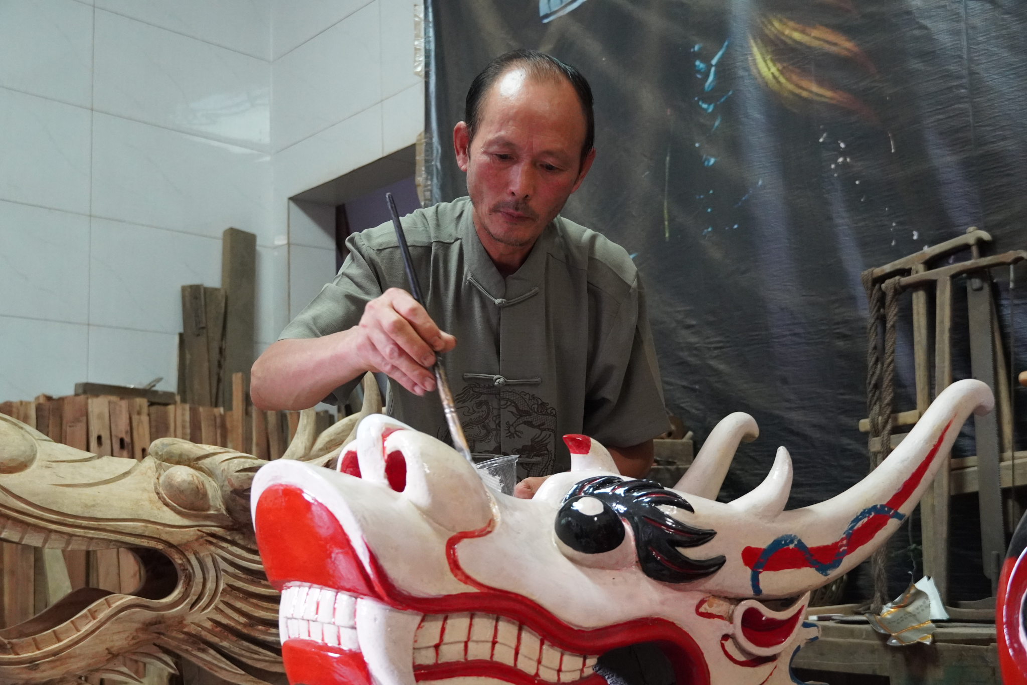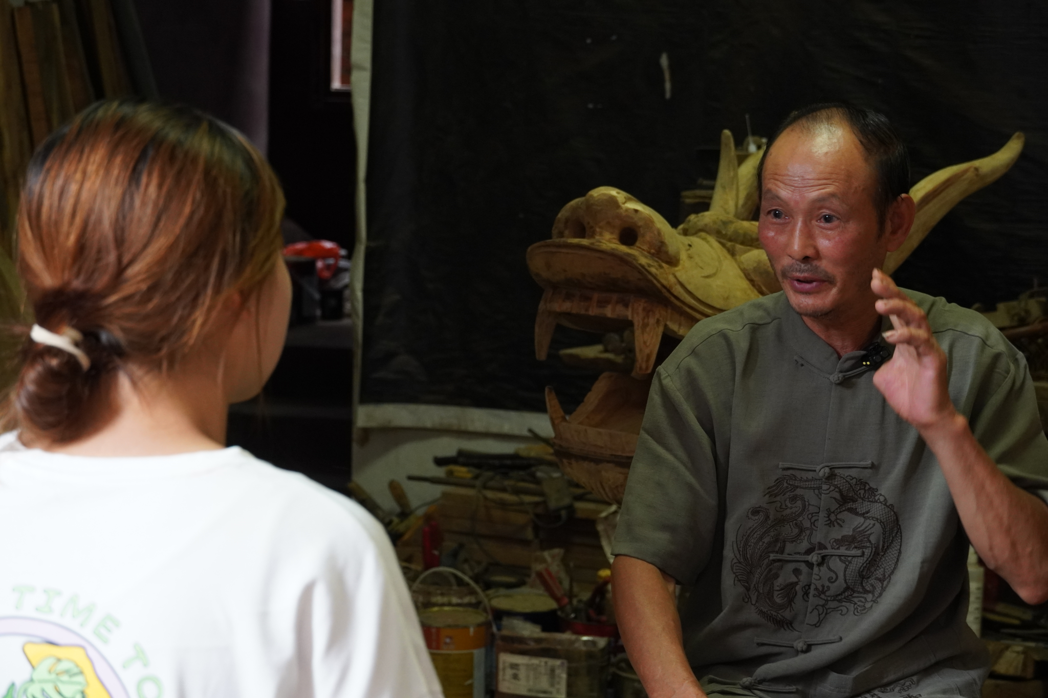 调研方面,成员们在当地负责人的帮助下对道县龙船头非遗传承人陈兵寿进行了访谈。访谈主要围绕道县龙船头的象征意义、制作工艺、市场需求、传承现状等展开,重点探究龙船头数字IP开发可行性。此外,成员们还进一步挖掘了陈兵寿与龙船的独特故事,以非遗传承人视角探索龙船头技艺与记忆的关联性。
