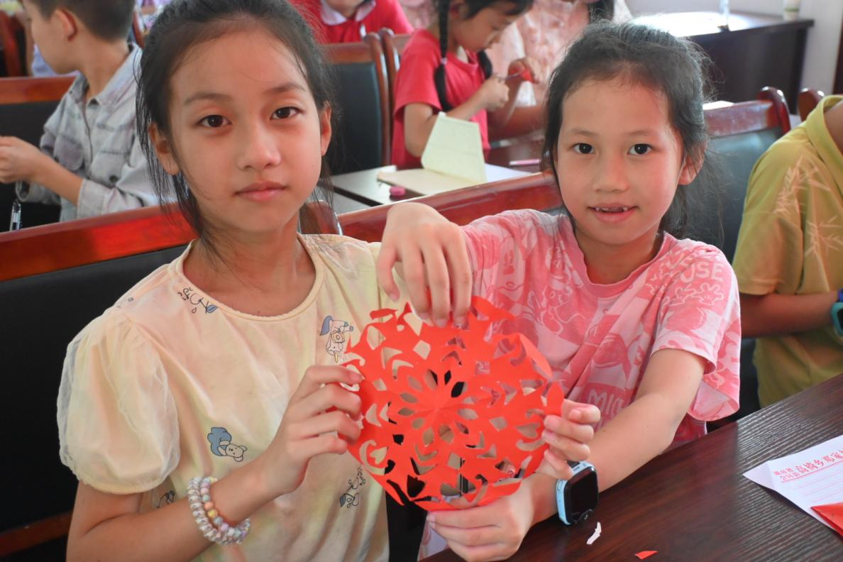 上午,实践团从孩子们的身心健康出发,开展了安全教育和心理健康教育课程。通过知识讲解和互动问答的形式,帮助孩子们增强防溺水意识,并认识情绪管理的重要性。随后,实践团带领孩子们学习非遗剪纸技艺。孩子们通过折叠红纸、绘制草稿并使用剪刀来完成作品,充分发挥创作潜力,制作多种图案,现场互动氛围活跃。